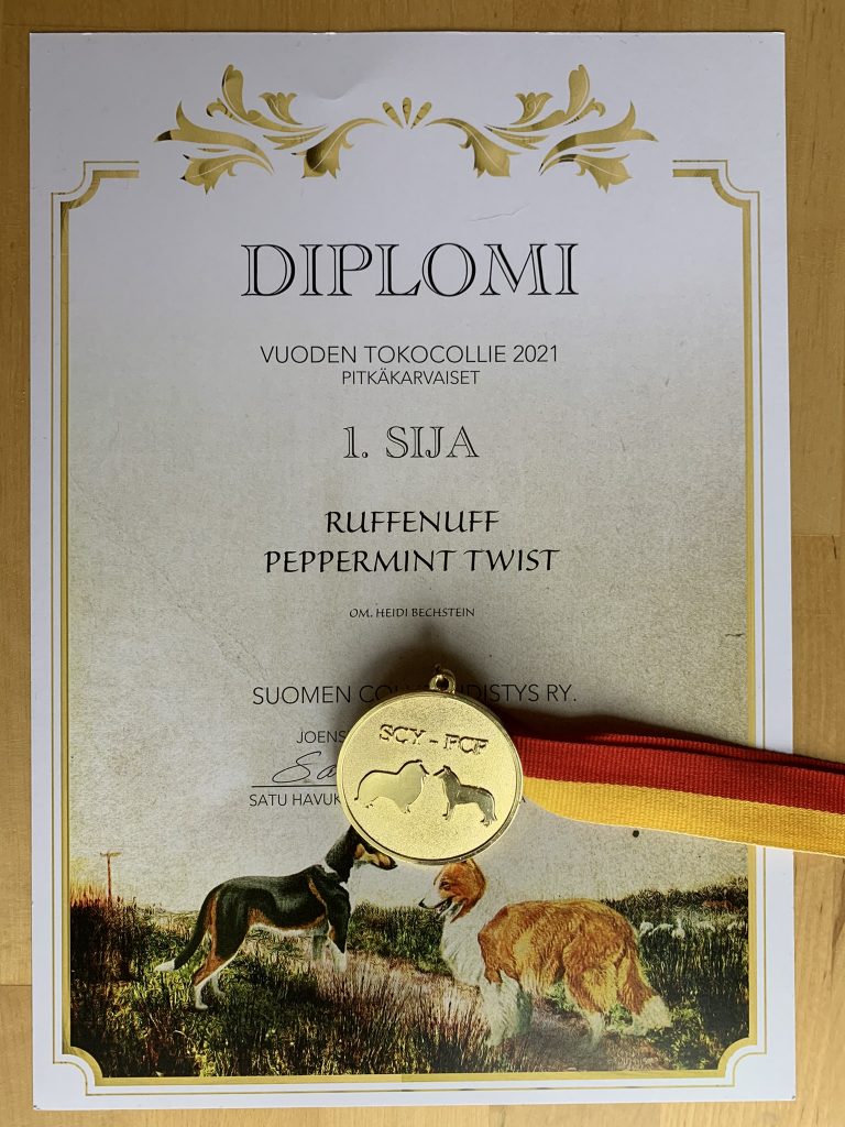 Pitkäkarvainen collieni Riemu (RTVA BH Ruffenuff Peppermint Twist) sai kunnian olla vuonna 2021 sekä collieiden tokomestari että vuoden tokocollie. Tokocollie-kilpailun voitto vahvistui, kun Suomen Collieyhdistys palkitsi vuosikokouksessaan Tampereella maaliskuun lopussa vuoden 2021 menestyneimmät harrastus- ja näyttelycolliet. Riemulle napsahti voittosija tokossa ja se palkittiin vuoden 2021 pitkäkarvaisena tokocolliena. Muillekin Riemumielen collieille tuli colliekilpailuissa hienosti menestystä eri lajeissa eli paimennuksessa, rally-tokossa ja tokossa. Pitkä- ja sileäkarvaiset colliet palkitaan colliekilpailuissa lajeissa erikseen.
