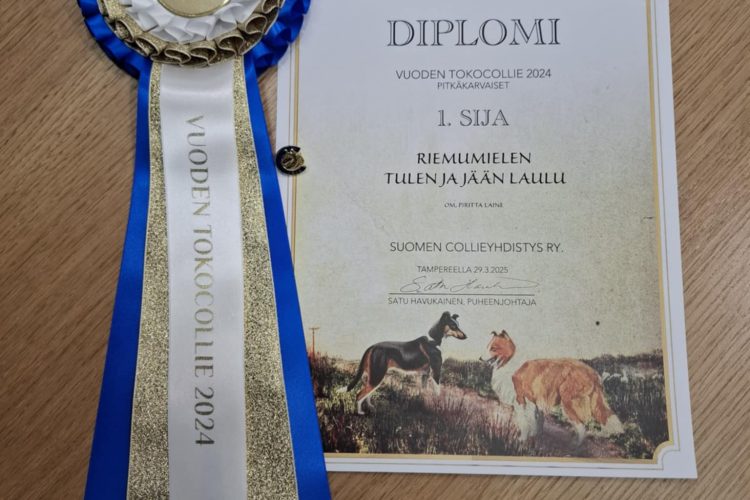 Suomen Collieyhdistys palkitsi vuosikokouksessaan 29.3.2025 vuoden 2024 colliekilpailuissa menestyneitä. Meillekin tuli vuosikokouksesta iloisia kuulumisia. Vuoden tokocollie 1. sija:Riemumielen Tulen Ja Jään Laulu (Rose), om. ja ohj. Piritta Laine Vuoden näyttelypentu 1. sija:Crofter’s Only Walking On Sunshine (Lilibet), om. Heidi Bechstein ja Marjo Hautaviita BH-kokeen suoritus:Riemumielen Hurjasusi Nymeria (Kaisla), om. ja ohj. kasvattaja Lisäksi muuta mainittavaa […]