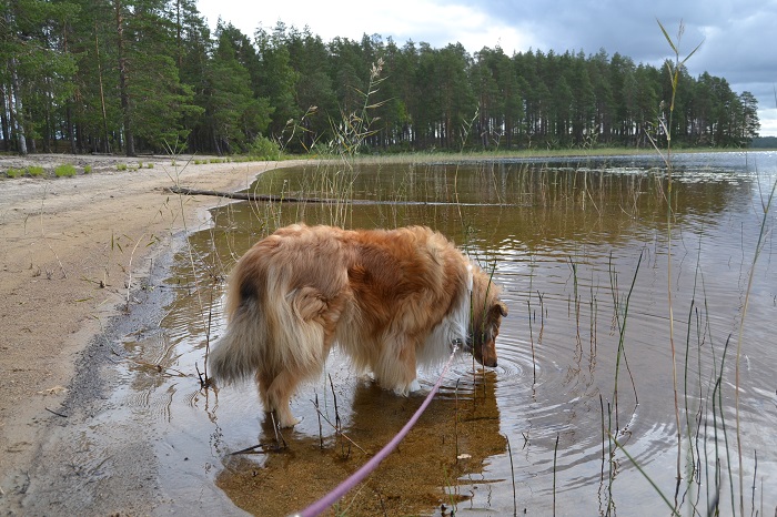 Sansan juomatauko Suomunjärven rannalla. Järvi on todella kirkasvetinen ja colliet kahlailivat rannassa mielellään. Vappu tai Sansa eivät kumpikaan ole uimareita, mutta olisin itse mennyt uimaan, jos sää olisi ollut lämpimämpi.