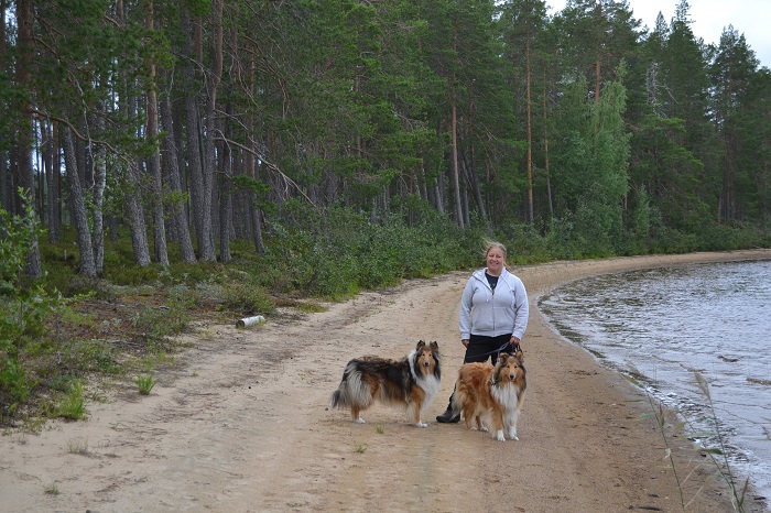 Minä ja colliet Vappu ja Sansa poseeraamassa Patvinsuon Suomunjärven hiekkarannalla. Suomunjärvellä on rantaviivaa 34 kilometriä, josta jopa 24 kilometriä on kaunista vaaleaa hiekkarantaa.