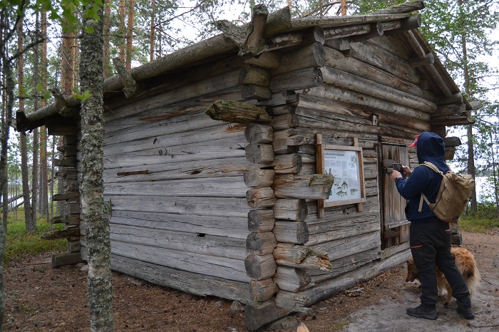 Jussi tutkii Kuikkaniemen kalasaunan opastaulua. Kuikkaniemen kalasauna löytyy aivan Kuikkaniemen päästä. Kuikkaniemessä oli jo 1600-luvulla asuttu pysyväluonteisesti. Nykyinen savupirtti, jo kolmas samalla niemellä sijaitseva, on rakennettu 1800-luvulla seudun asukkaiden kalasaunaksi. (Lähde: opastaulu)