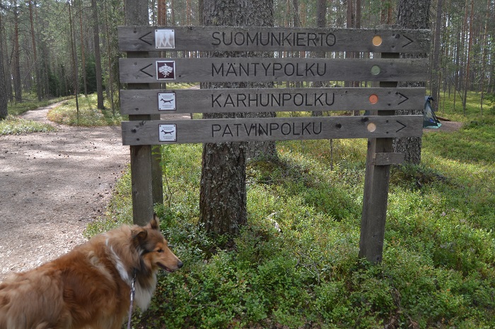 Sansa on valmiina lähtöön. Aloitimme reitin Mäntypolkua pitkin, jota kuljimme pari kilometriä Kuikkaniemeä kohti. Mäntypolku on kokonaisuudessaan 4,5 kilometrin pituinen, josta kuljimme siis noin puolet ja jatkoimme Suomunkierron reitille. Patvinsuon polut ovat melko helppokulkuisia ja hyvin maastoon merkittyjä.