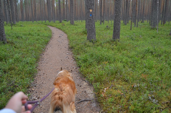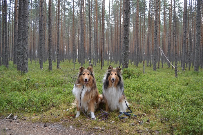 Molempien osittain kulkemiemme reittien vaativuusluokiksi on merkitty helppo ja allekirjoitan tämän täysin. Raskaimmat osuudet olivat sellaisia pätkiä, joilla polkujen kunto oli päässyt huonoksi ja poluilla oli runsaasti korkeita paljaita puunjuuria, joita täytyi varoa kulkiessa ja nostella jalkoja korkeammalle. Collietytöt jaksoivat kulkea mukana reippaina alusta loppuun. Eteneminen sujui parhaiten, kunhan Vappu kulki joukon johdossa ja Sansa seurasi sen perästä. Toisinpäin sujuminen ei ollut niin sujuvaa, koska silloin Sansan vauhti hiipui.