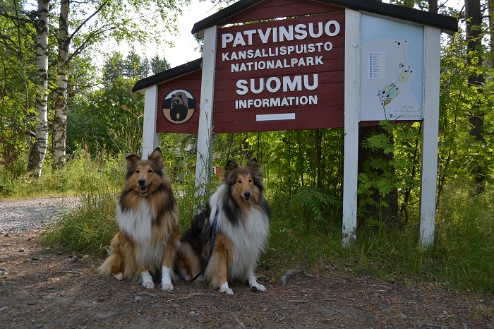 Collietytöt Sansa (RTK2 Goldentroll’s Song Of Ice And Fire) ja Vappu (RTK1 Riemumielen Hunajatassu) Patvinsuon kansallispuiston infokyltillä. Kansallispuiston logoa koristaa karhu ja niitä elääkin kansallispuiston alueella runsaasti. Patvinsuon kansallispuisto on perustettu vuonna 1982. Sen pinta-ala on 105 neliökilometriä ja alueella on 80 kilometriä merkittyjä polkuja.